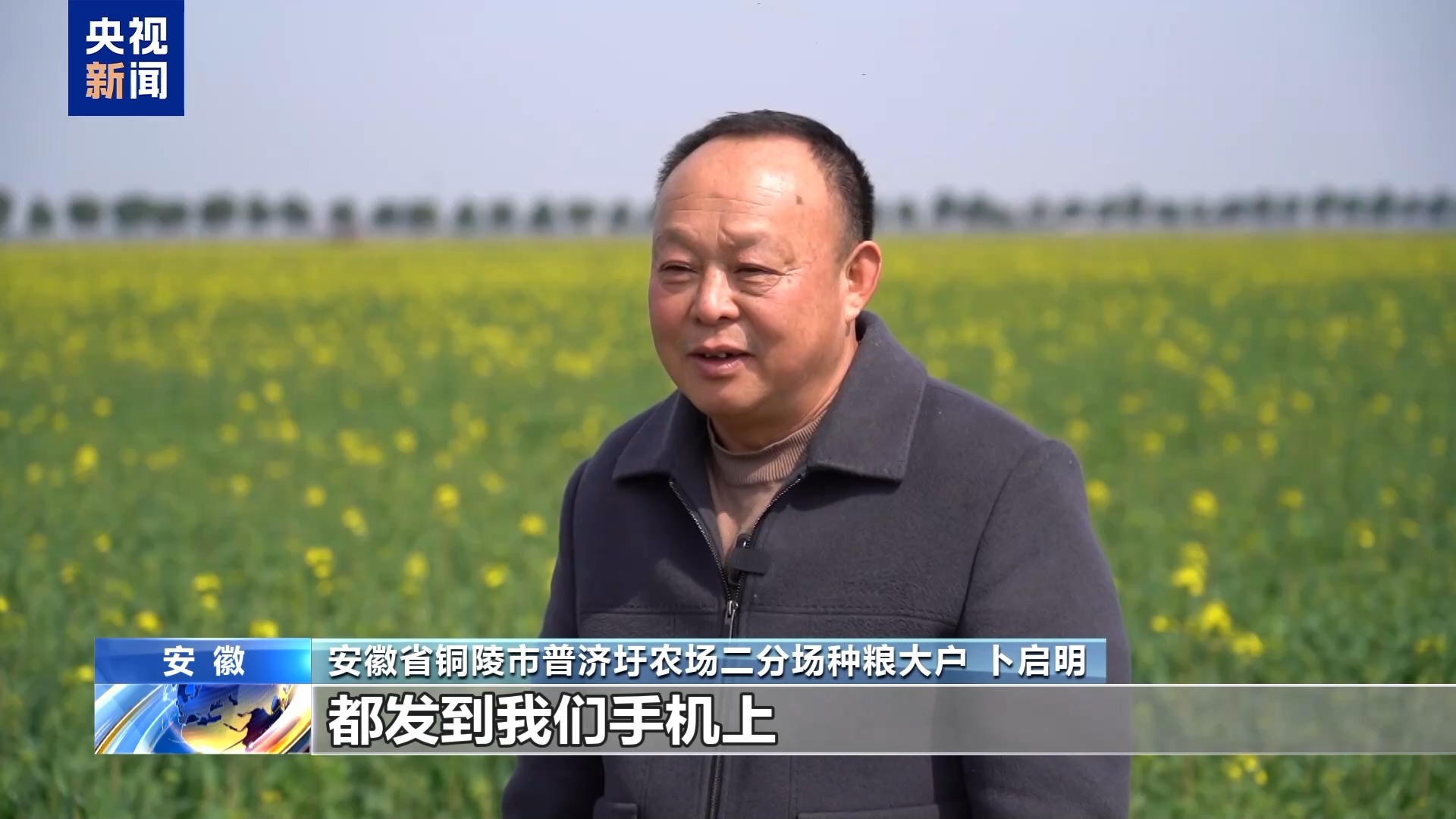 安徽省銅陵市普濟圩農(nóng)場二分場種糧大戶 卜啟明:以前我們種糧靠天收,在電視上看天氣預報,現(xiàn)在科技發(fā)達了,都發(fā)到我們手機上。