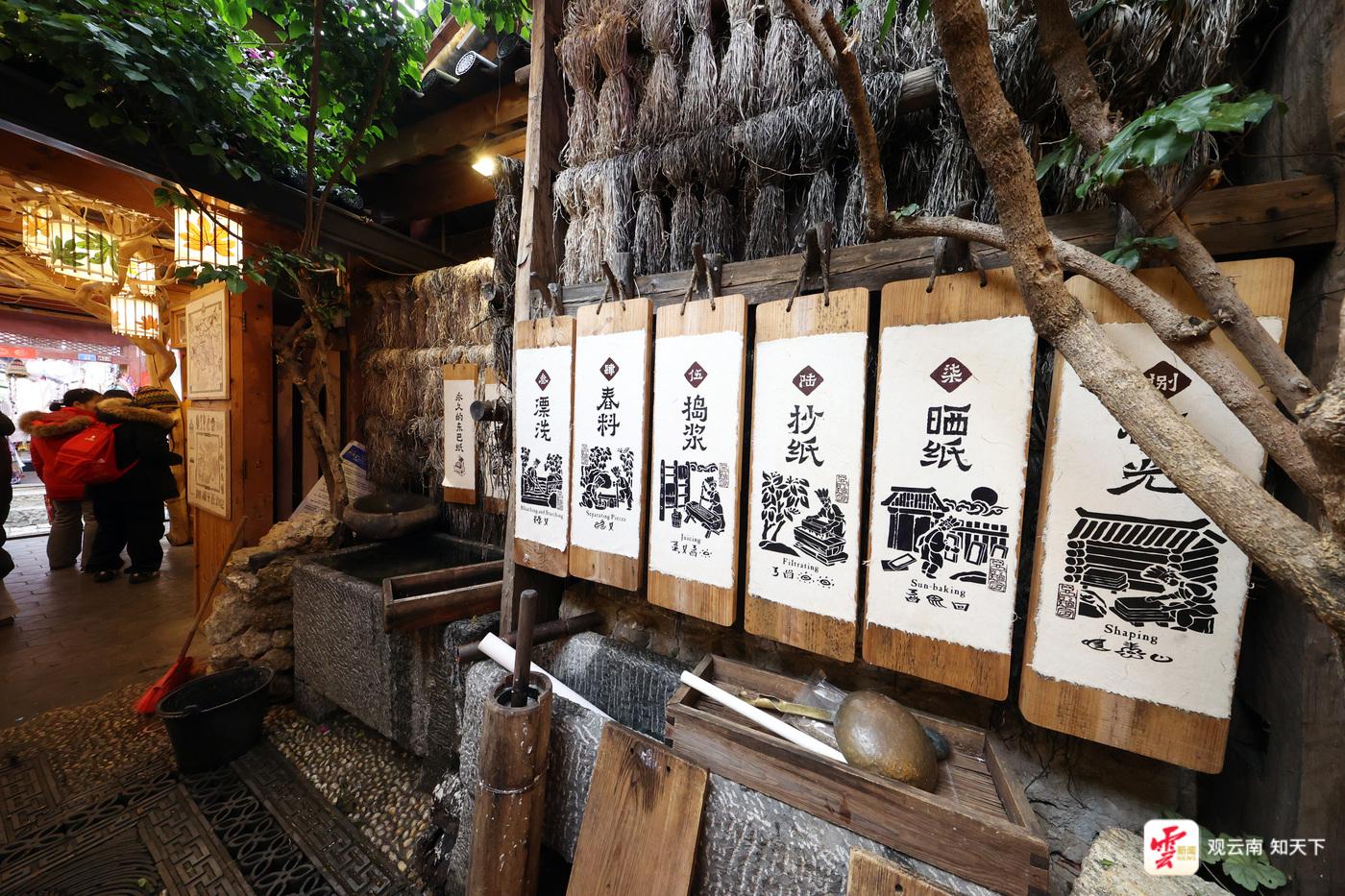 麗江古城內(nèi)以東巴文化體驗為亮點的“東巴紙坊”吸引著許多中外游客。在這里,游客們可以體驗到搗漿、抄紙、曬紙等東巴紙制作工藝,還能拿起東巴象形文字印章集章打卡。如果你好奇某個象形文字的含義,還能在這里買到一本東巴文“字典”,一一對照查看。“相比往年,今年多了不少來自新加坡、馬來西亞的游客,東巴紙燈、明信片都是很受他們喜愛的產(chǎn)品?!睎|巴紙坊麗江銷售人員韓雨辰說。
