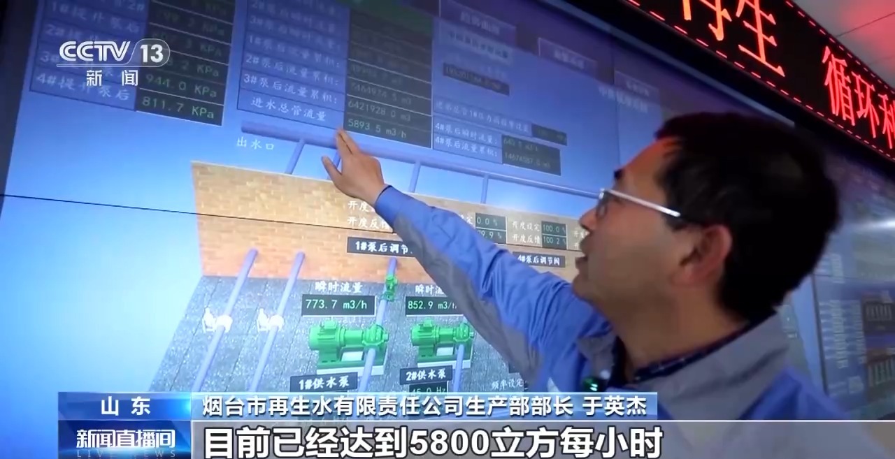 煙臺市再生水有限責(zé)任公司生產(chǎn)部部長 于英杰:萬華工業(yè)園區(qū)供水的實時流量顯示,目前已經(jīng)達(dá)到5800立方/小時,全天累計14.5萬立方。