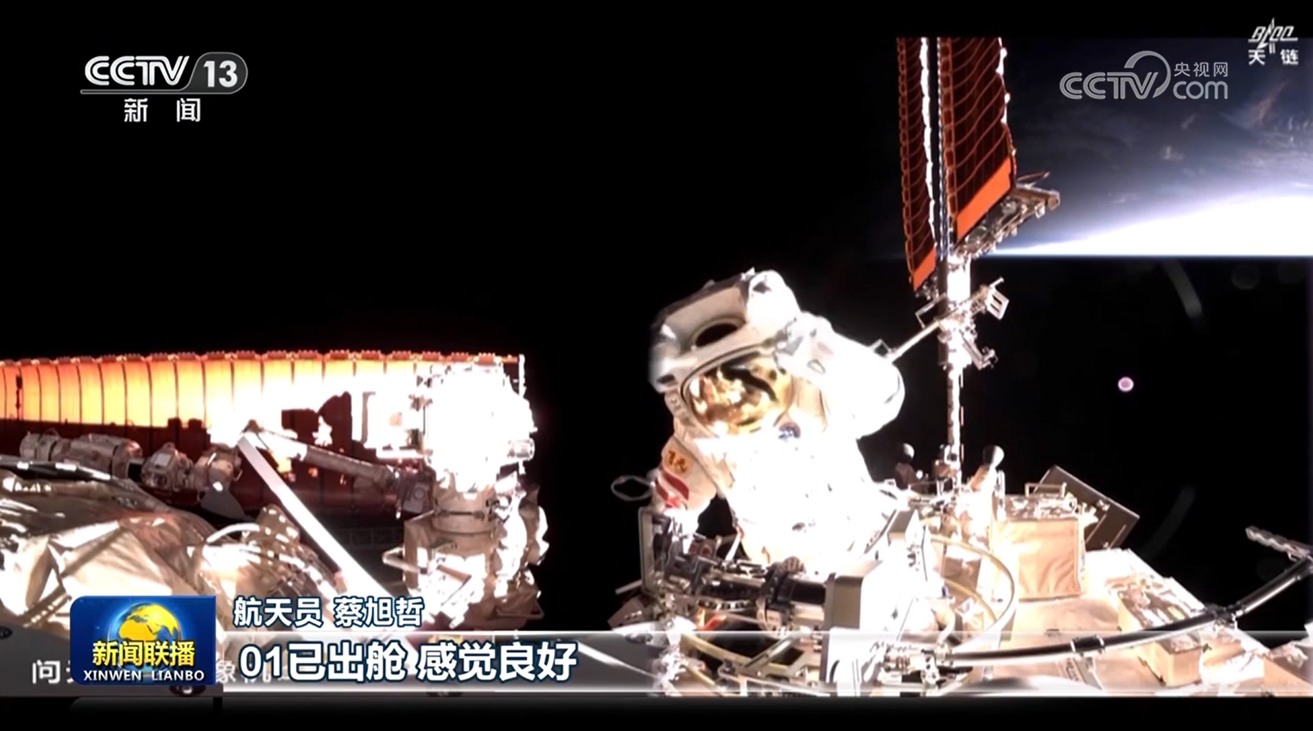 13時(shí)45分,航天員蔡旭哲打開(kāi)出艙艙門(mén),首先出艙。