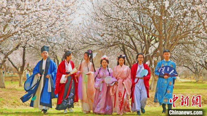 庫(kù)車杏花綻放,游人身著古裝漫步杏園。(資料圖)庫(kù)車市融媒體中心供圖