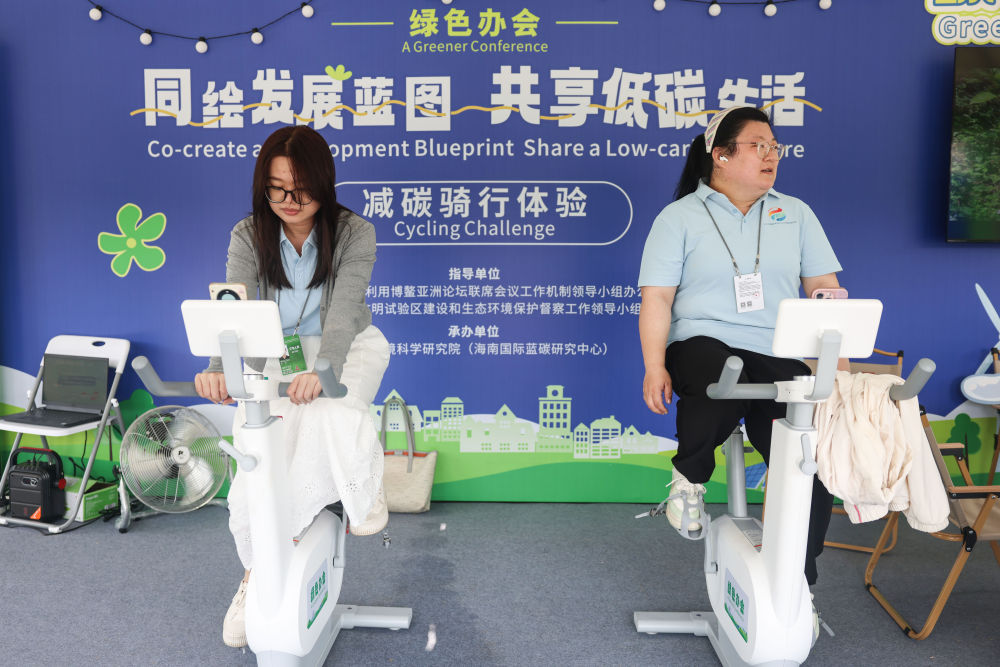3月25日,參會人員在博鰲東嶼島文化公園內體驗減碳騎行活動。