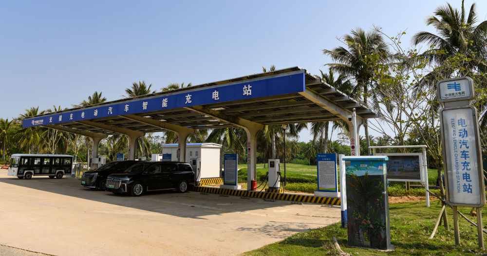 這是3月25日拍攝的博鰲零碳示范區(qū)內的電動汽車充電站。