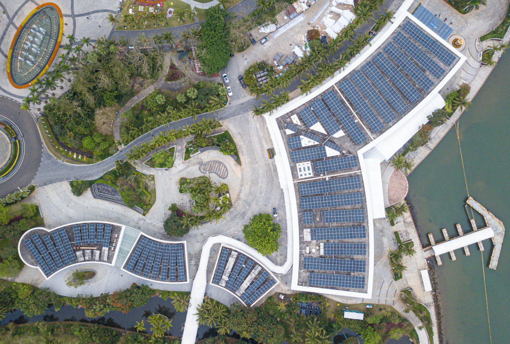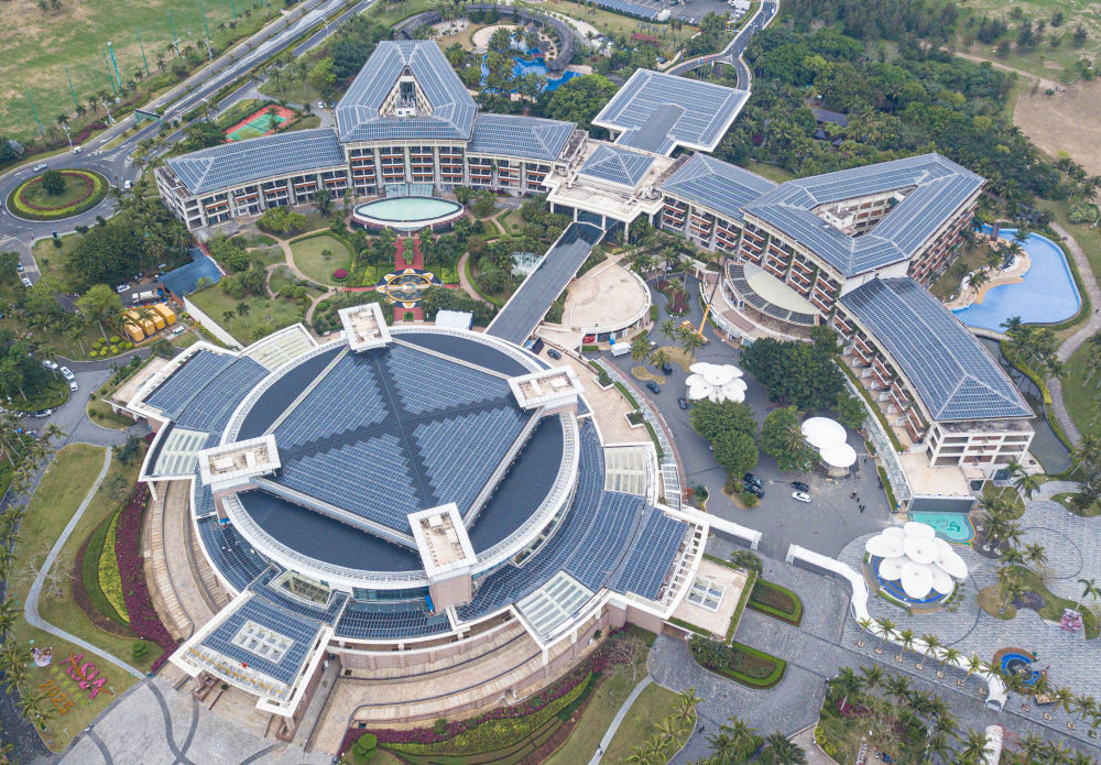 這是在博鰲零碳示范區(qū)拍攝的博鰲亞洲論壇新聞中心及配樓屋頂的光伏設備(無人機照片,3月16日攝)。