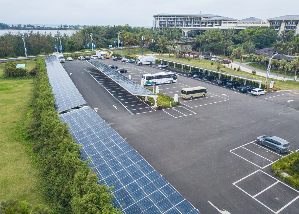 在博鰲零碳示范區(qū)拍攝的建有光伏發(fā)電設備的停車場(無人機照片,3月16日攝)。