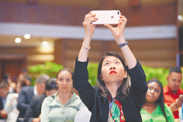 在全球自由貿易港發(fā)展論壇現(xiàn)場,與會嘉賓用手機記錄。海南日報全媒體記者 王程龍 攝