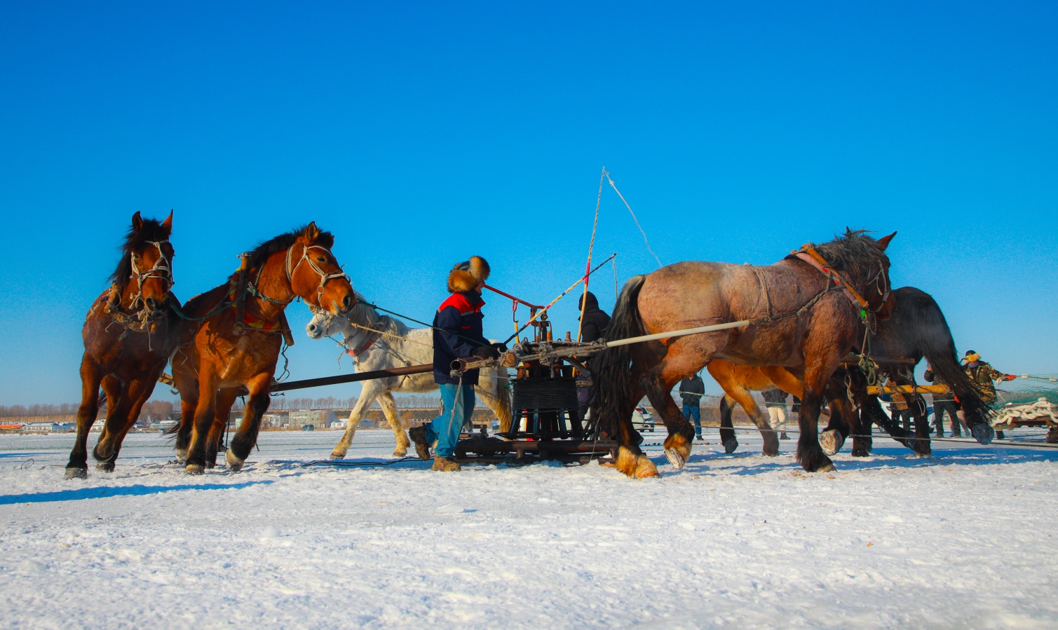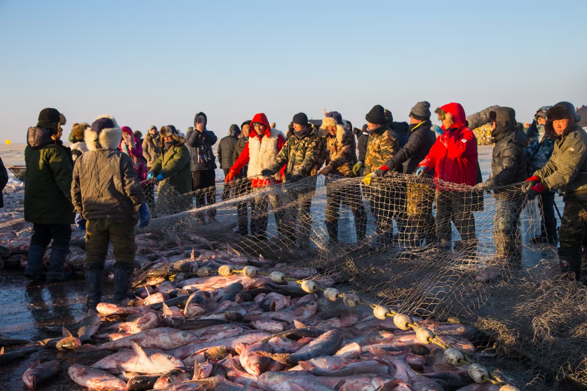 祭湖醒網(wǎng)、馬拉絞盤、冰下走網(wǎng)……一場冬捕盛宴正在千里冰封的查干湖上演。頭戴狐皮帽、身披羊皮襖、手持令旗的“魚把頭”一聲令下,巨大的漁網(wǎng)被緩緩從冰下拉出,隨著數(shù)萬條活魚從水中“躍”起,“冰湖騰魚”的盛景讓傳承千年的漁獵文化在冰天雪地中再度“沸騰”。