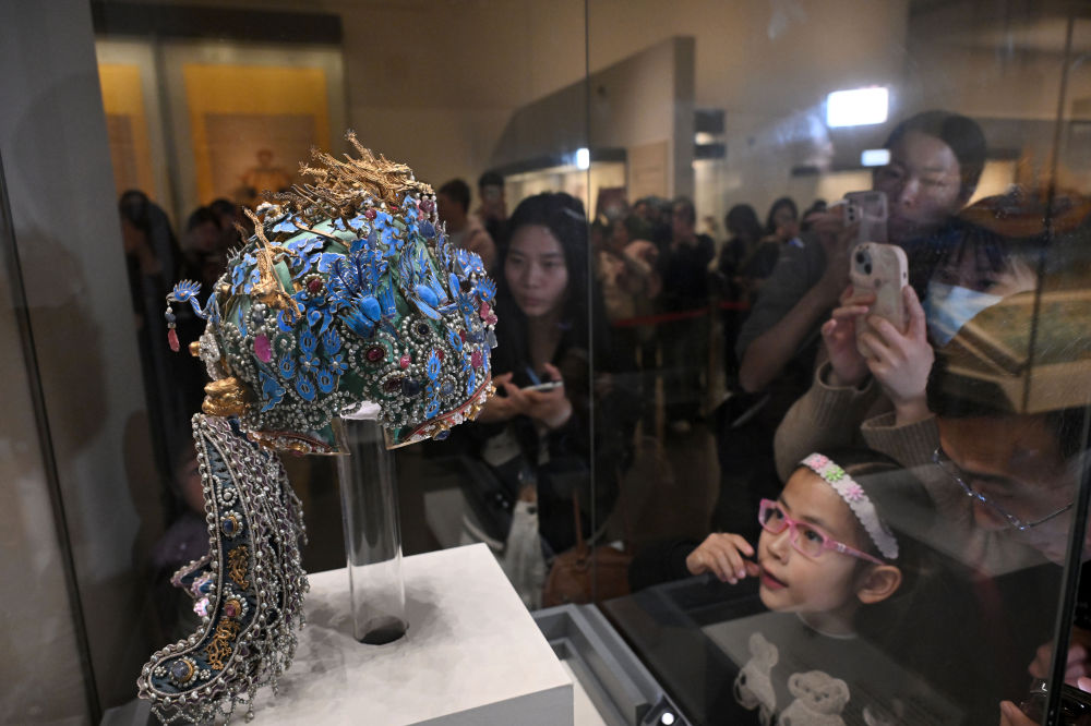 3月25日,觀眾在北京中國(guó)國(guó)家博物館觀看明孝端皇后九龍九鳳冠。(新華社記者 金良快 攝)