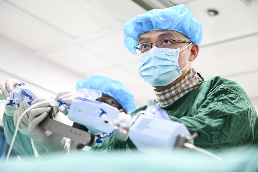 2月20日,在南京市第一醫(yī)院,張俊杰和團隊在心導管室為患者進行經(jīng)導管二尖瓣緣對緣修復手術。(新華社記者 季春鵬 攝)