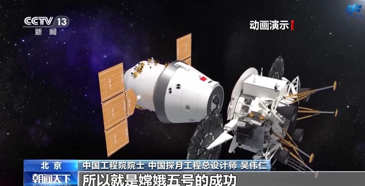 中國工程院院士 中國探月工程總設計師 吳偉仁:當時就想利用嫦娥五號來驗證我們后續(xù)載人登月技術,載人登月就是在軌道上交會對接,然后人下去探測,探測完后月面起飛,在軌道上交會對接,然后人再進入返回器,返回器再和軌道器脫離,脫離過后,返回器把人送回地球。所以嫦娥五號的成功,為未來我們載人登月奠定基礎,幾乎把所有的關鍵技術都驗證了一遍。