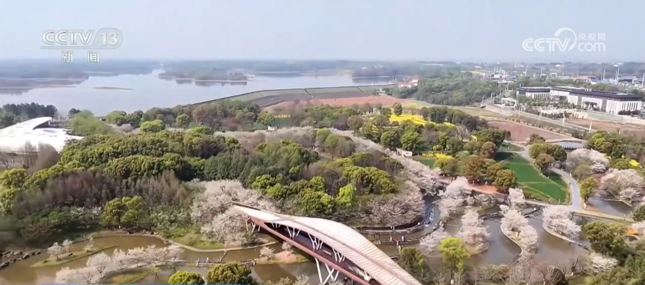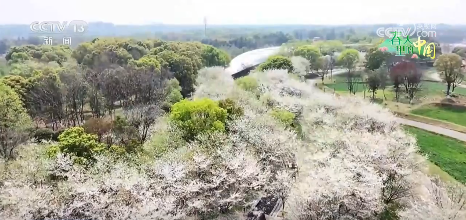景區(qū)內(nèi)整排的櫻花綿延綻放,形成了一片粉白色的花海。微風拂過,粉白的花瓣隨風飄舞,游客們漫步在櫻花樹下,拿出手機、相機,記錄這春日好風景。