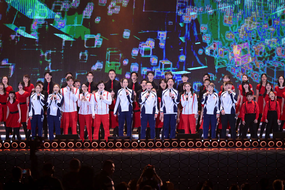 3月1日,在香港啟德體育園開幕典禮上,內(nèi)地與香港運(yùn)動員代表合唱歌曲。新華社記者 朱煒 攝