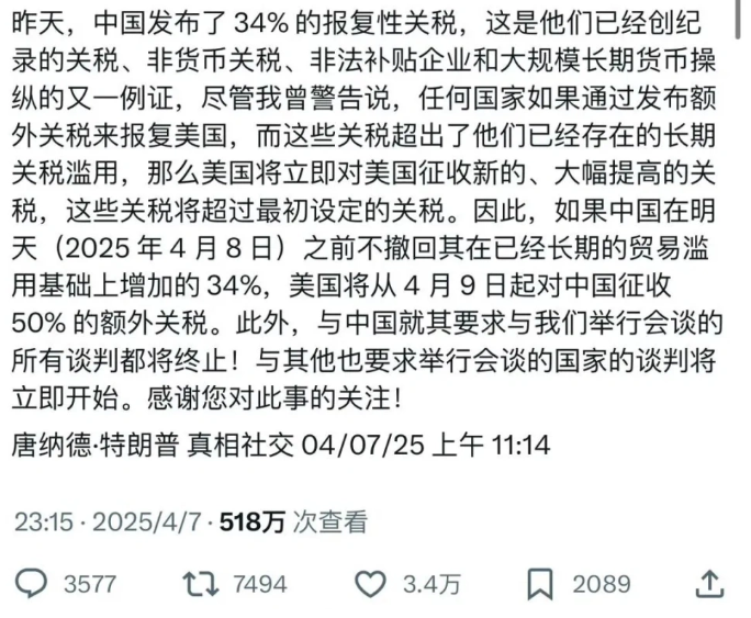 一覺醒來,特朗普再發(fā)威脅,警告中國在4月8號前取消報(bào)復(fù),不然4月9號就對中國再加50%額外關(guān)稅,此外所有和中國的談判都會中止,而和其他國家的談判將立即開始。