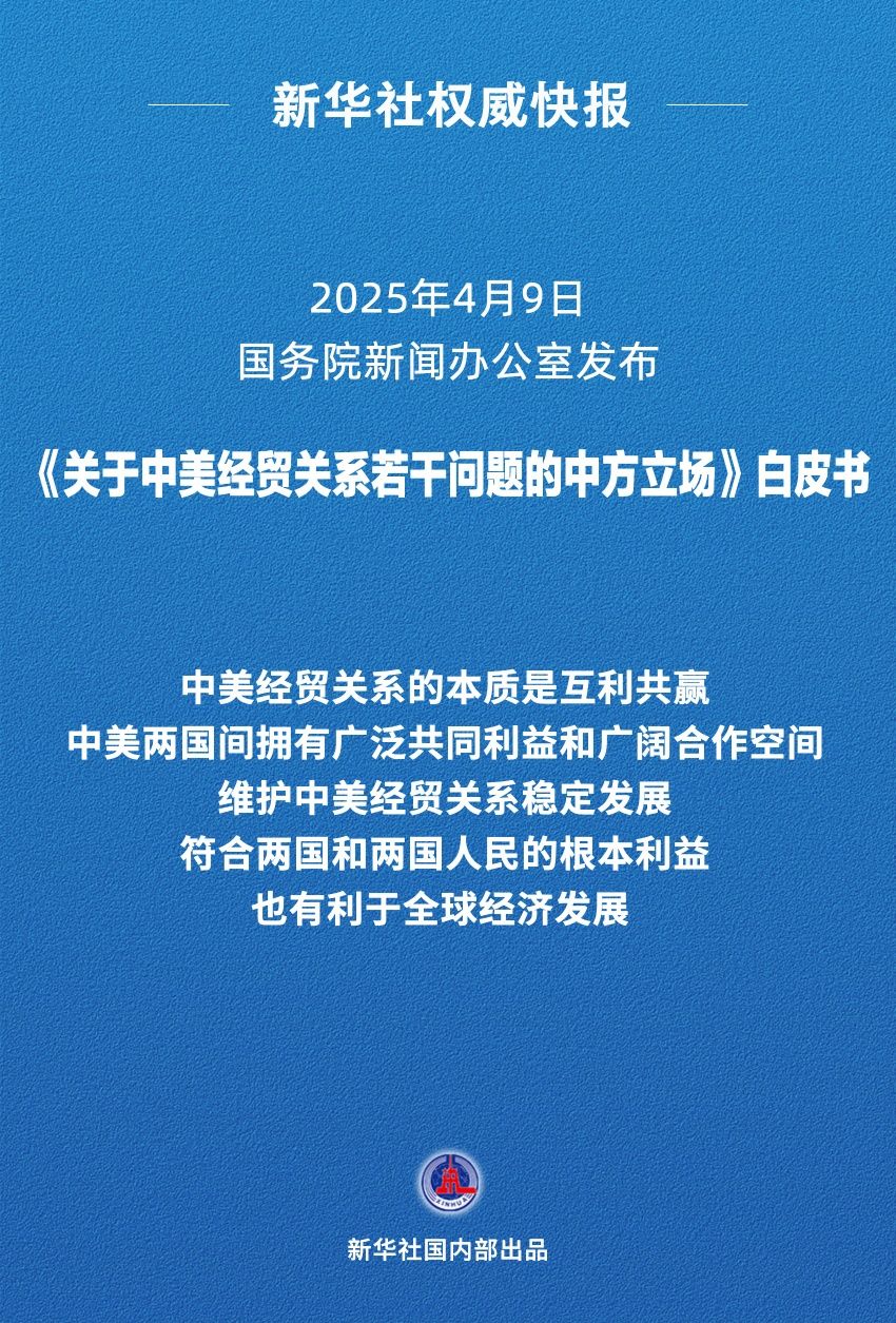 國(guó)務(wù)院新聞辦公室4月9日發(fā)布《關(guān)于中美經(jīng)貿(mào)關(guān)系若干問(wèn)題的中方立場(chǎng)》白皮書(shū),澄清中美經(jīng)貿(mào)關(guān)系事實(shí),闡明中方對(duì)相關(guān)問(wèn)題的政策立場(chǎng)。