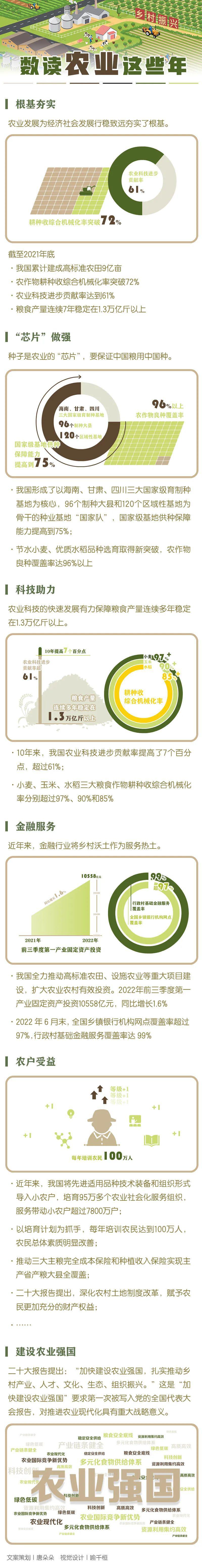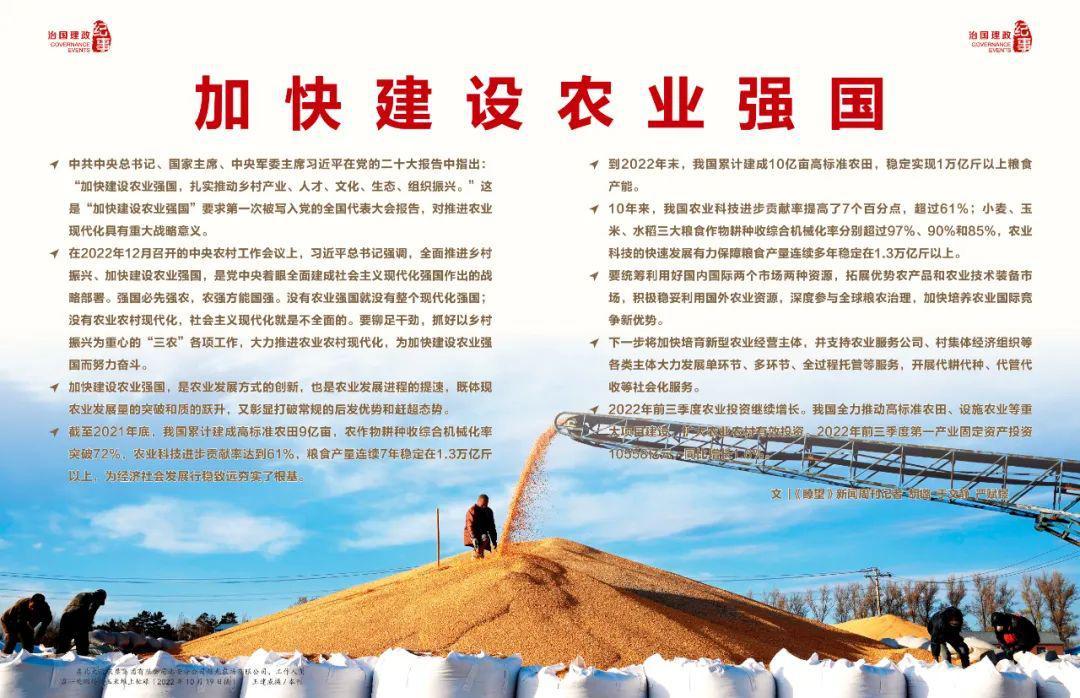 ◆ 中共中央總書記、國家主席、中央軍委主席習近平在黨的二十大報告中指出:“加快建設農業(yè)強國,扎實推動鄉(xiāng)村產業(yè)、人才、文化、生態(tài)、組織振興?!边@是“加快建設農業(yè)強國”要求第一次被寫入黨的全國代表大會報告,對推進農業(yè)現(xiàn)代化具有重大戰(zhàn)略意義。