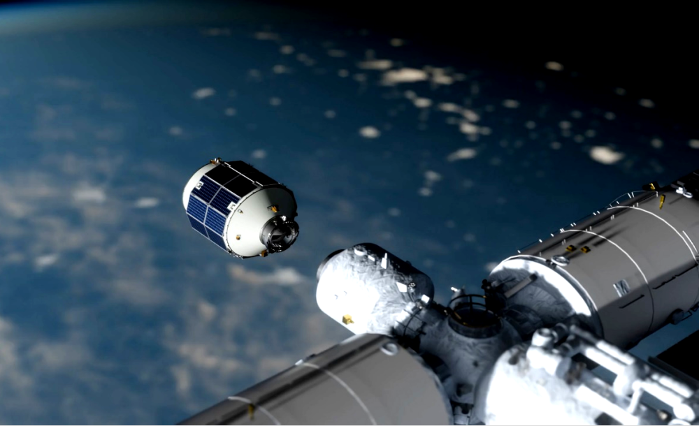 輕舟貨運(yùn)飛船與中國(guó)空間站對(duì)接示意圖。(中國(guó)科學(xué)院微小衛(wèi)星創(chuàng)新研究院供圖)