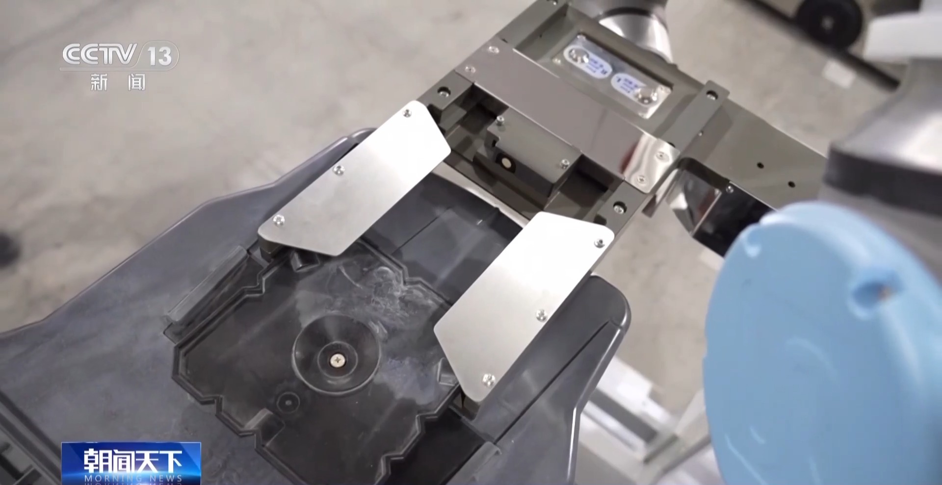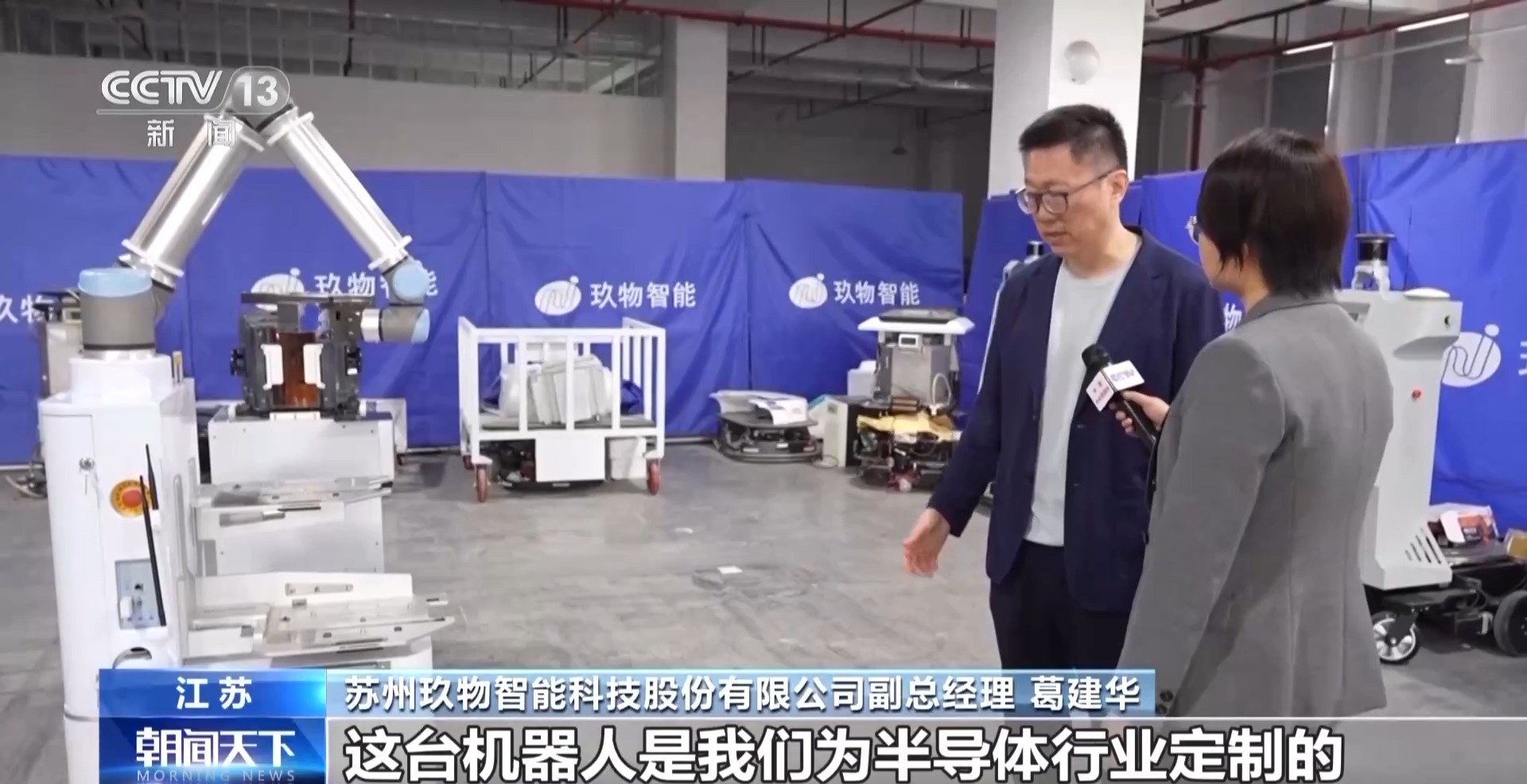 蘇州玖物智能科技股份有限公司副總經(jīng)理 葛建華:這臺機器人是我們?yōu)榘雽w行業(yè)定制的。我們現(xiàn)在抓取的這個設備,其實是一臺晶圓盒,這個晶圓片模型其實特別薄、特別脆,震動稍微厲害一點就會有裂痕,機械臂的精度可以達到0.1毫米。
