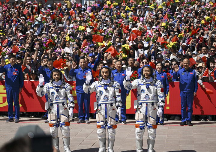 4月24日,神舟二十號載人飛行任務(wù)航天員乘組出征儀式在酒泉衛(wèi)星發(fā)射中心問天閣圓夢園廣場舉行。這是航天員陳冬(右)、陳中瑞(中)、王杰在出征儀式上。新華社記者 連振 攝