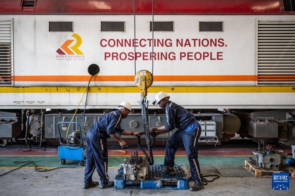 2025年1月23日,在肯尼亞內(nèi)羅畢蒙內(nèi)鐵路車(chē)間,維保人員在一輛印有“連接國(guó)家 走向繁榮”標(biāo)語(yǔ)的蒙內(nèi)鐵路機(jī)車(chē)前檢修配件。 新華社記者 王冠森 攝