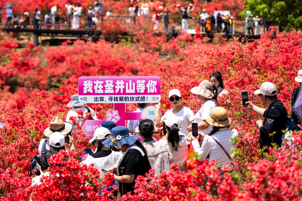 2025年4月16日,游客在浙江省瑞安市馬嶼鎮(zhèn)圣井山杜鵑花海賞花。新華社發(fā)(孫凜攝)