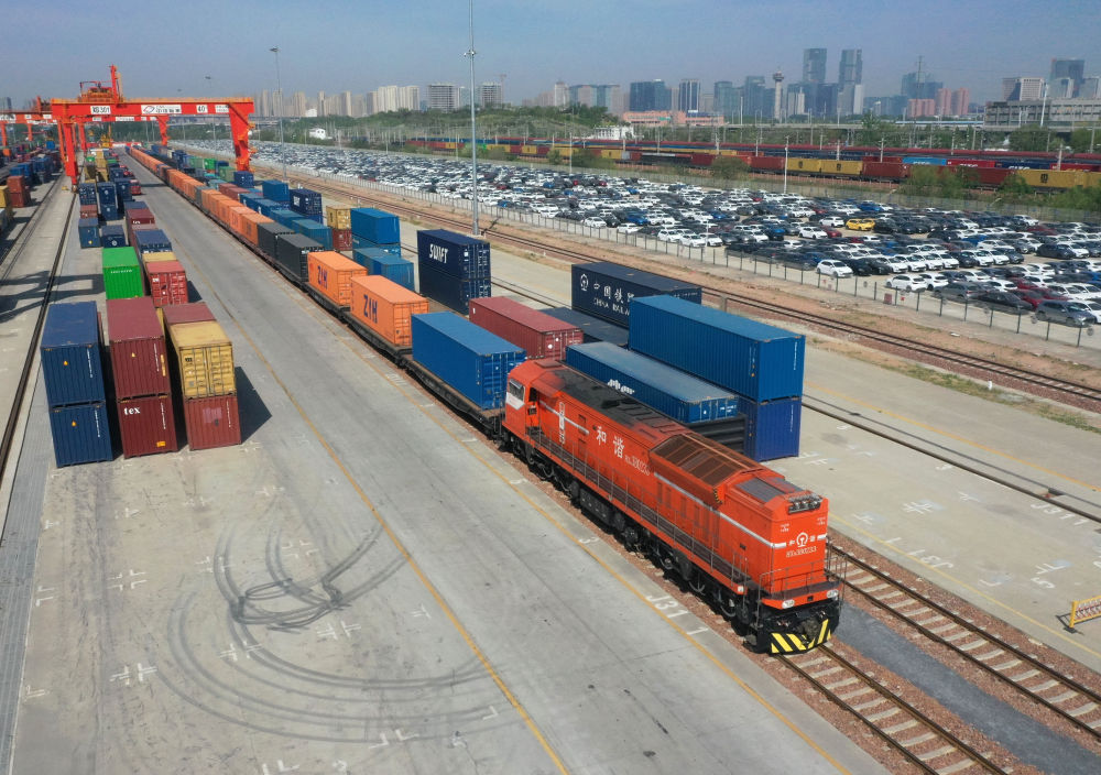 2025年4月15日,X8003次中歐班列(鄭州)??吭趪?guó)鐵集團(tuán)鄭州局圃田車(chē)站(無(wú)人機(jī)照片)。新華社記者 李嘉南 攝