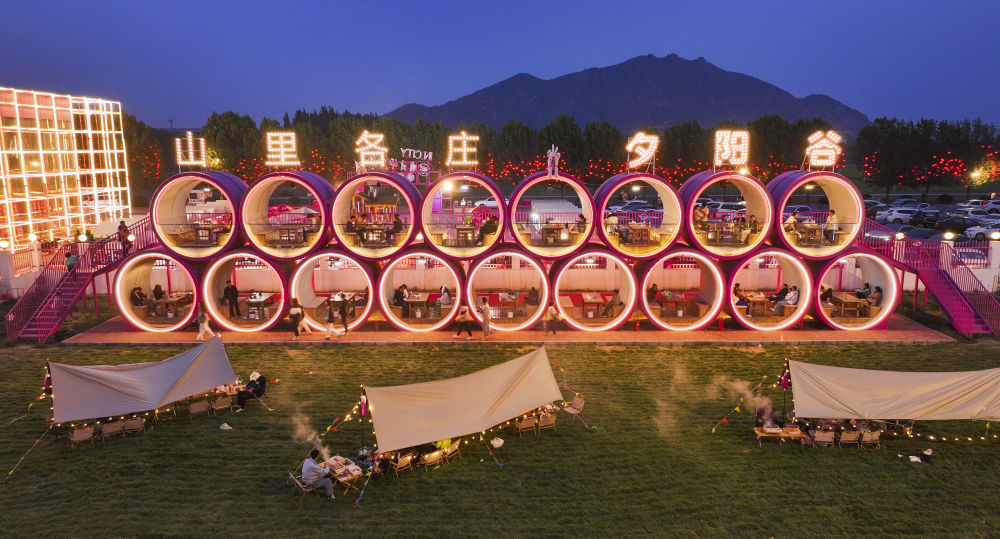 5月5日,游客在河北省遵化市夕陽(yáng)谷景區(qū)游玩時(shí)品嘗美食(無(wú)人機(jī)照片)。