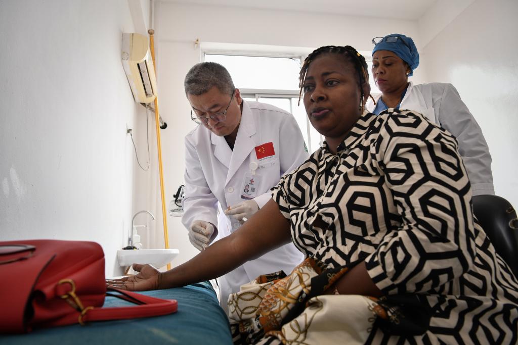 2025年4月29日,在位于幾內亞首都科納克里的中幾友好醫(yī)院,中國醫(yī)療隊醫(yī)生劉路遙為患者做針灸治療。新華社記者韓旭攝