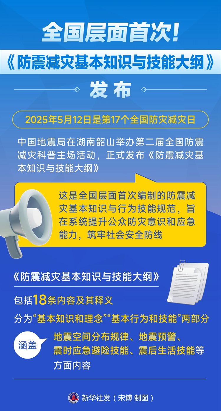 今年5月12日是第17個(gè)全國防災(zāi)減災(zāi)日。當(dāng)天,中國地震局在湖南韶山舉辦第二屆全國防震減災(zāi)科普主場活動,正式發(fā)布《防震減災(zāi)基本知識與技能大綱》,這是全國層面首次編制的防震減災(zāi)基本知識與行為技能規(guī)范,旨在系統(tǒng)提升公眾防災(zāi)意識和應(yīng)急能力,筑牢社會安全防線。
