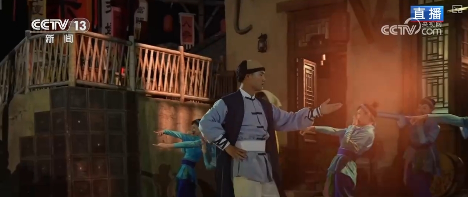 實際上,這處街道只是整場演出中的一幕。游客隨演員一路向前,長達(dá)1個小時的劇情講述了百年前一名外國導(dǎo)演來到鄭州,尋找太極的故事。其間,會串聯(lián)起景區(qū)的不同場景,比如走過繁華的“老鄭州”街道,后面就變成了一個古樸的村落。置景取材于太極拳發(fā)源地之一的河南焦作陳家溝,村里既有講述拜師學(xué)藝故事的情景劇,又有以太極功夫編排的舞蹈表演,體現(xiàn)出中原地區(qū)的多樣歷史文化。