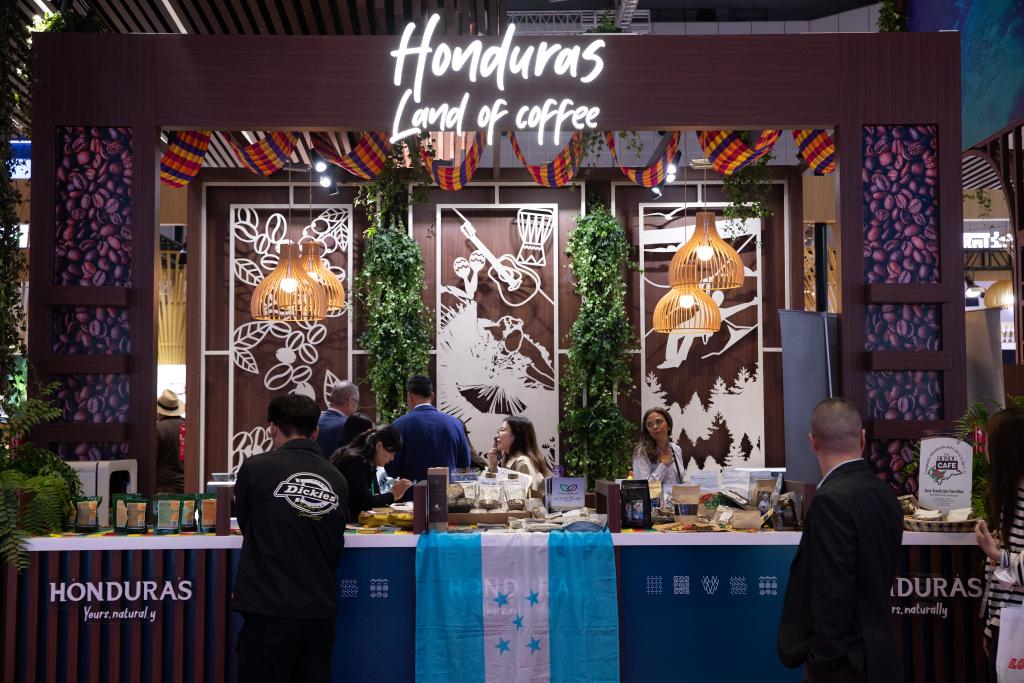 2023年11月6日,參觀者在第六屆進(jìn)博會國家展洪都拉斯展臺咨詢咖啡豆等展品信息。新華社記者 金立旺 攝