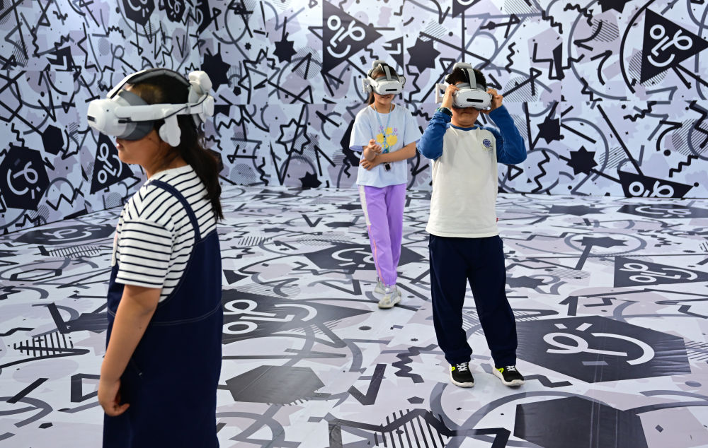 4月26日,小朋友們在第三屆中國(安徽)科技創(chuàng)新成果轉化交易會上體驗VR設備。新華社記者 周牧 攝