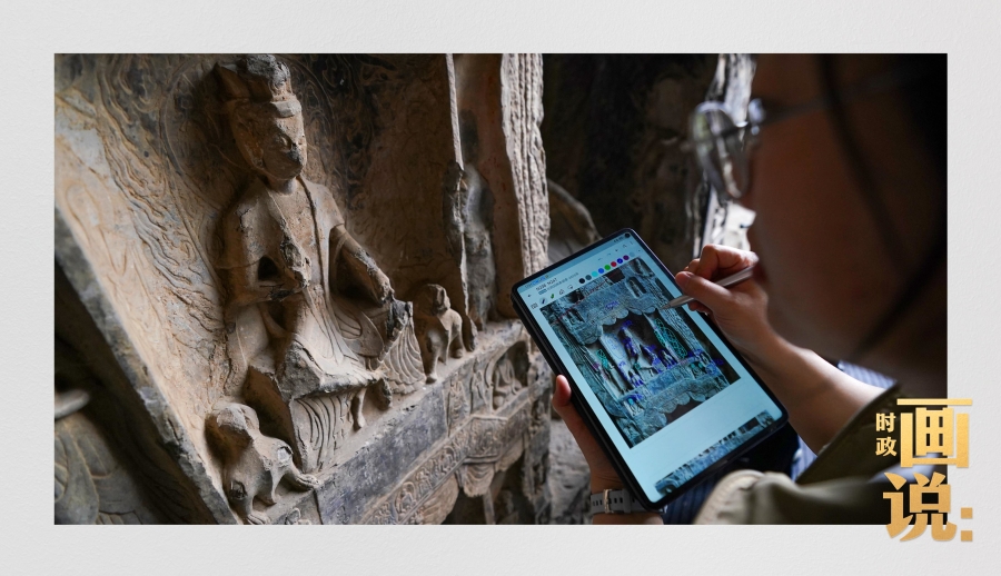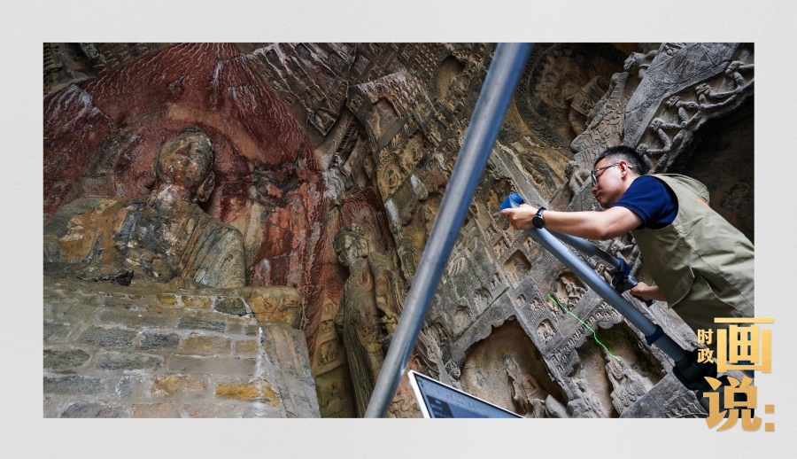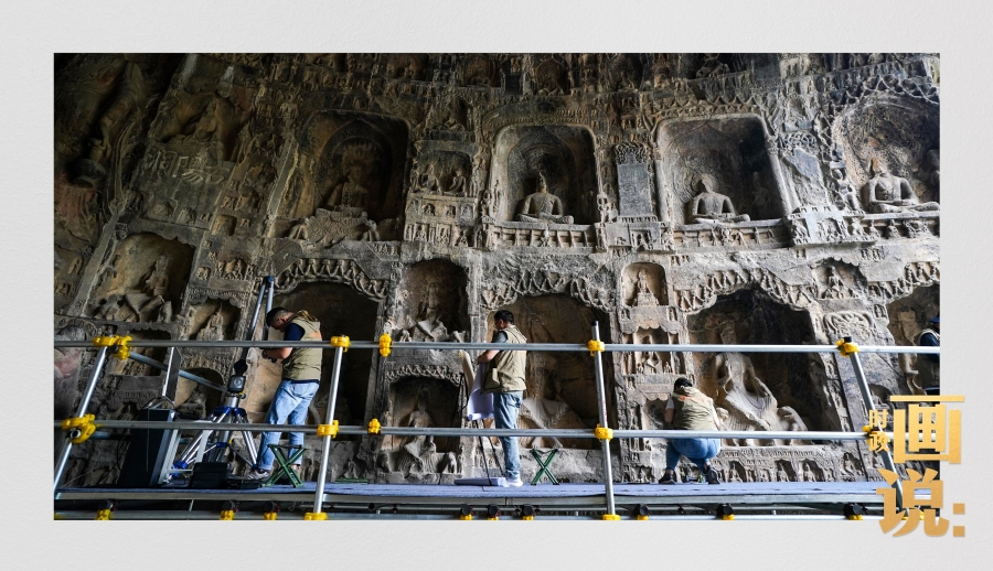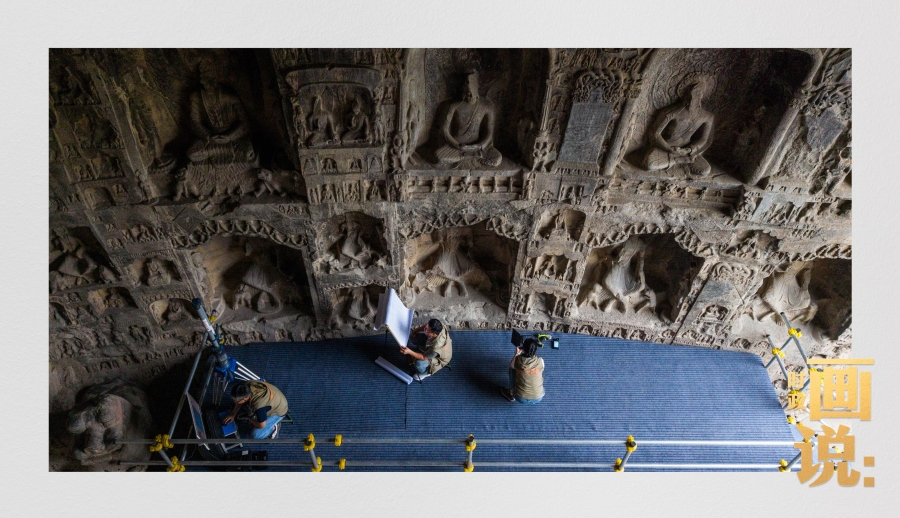 龍門石窟研究院工作人員在古陽洞使用關(guān)節(jié)臂掃描儀對佛像進行數(shù)字化掃描