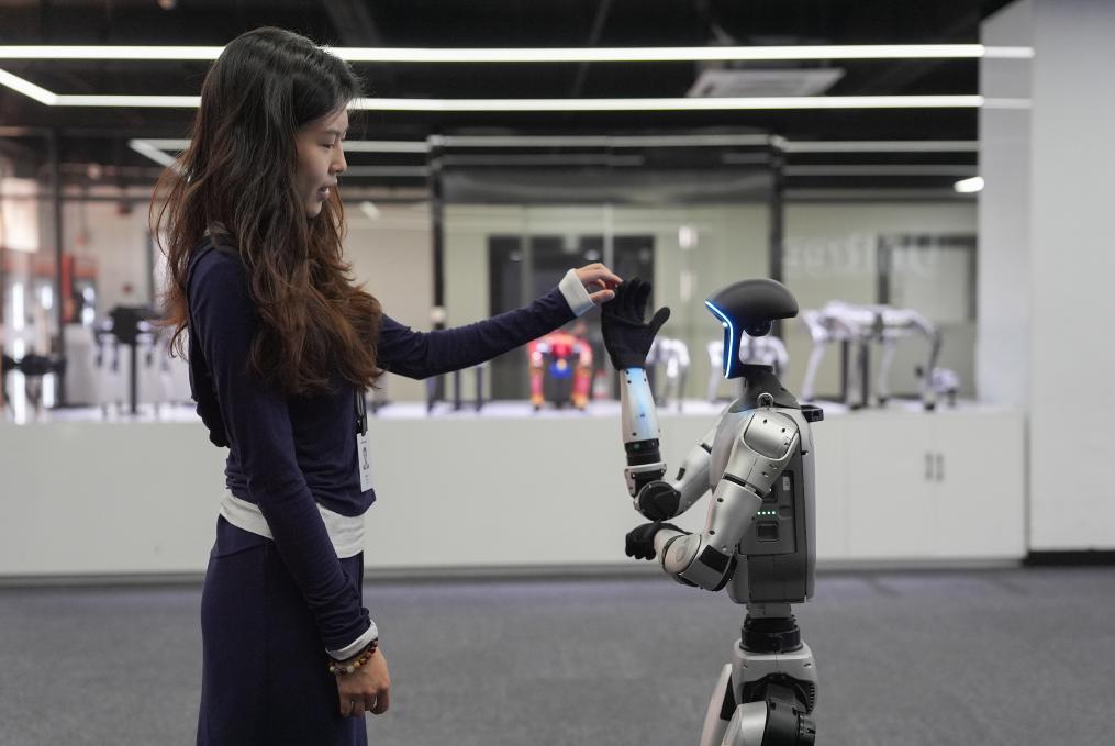 4月23日,在知名機(jī)器人公司杭州宇樹(shù)科技展廳內(nèi),宇樹(shù)人形機(jī)器人G1展示模仿動(dòng)漫角色奧特曼的“光波”動(dòng)作。 新華社記者 黃宗治 攝