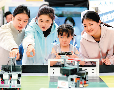 4月28日,在福建省福州市鼓樓區(qū)鼓東街道冶山春秋園,小朋友正在體驗(yàn)足球機(jī)器人。謝貴明攝(人民視覺(jué))