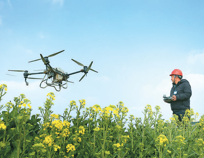 3月6日,江蘇省南通市通州區(qū)劉橋鎮(zhèn)無(wú)人農(nóng)機(jī)示范基地,種植戶(hù)在田間操控調(diào)試植保無(wú)人機(jī)。許叢軍攝(人民視覺(jué))