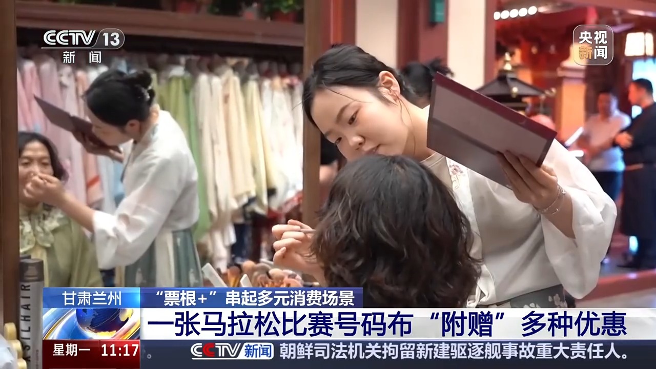 在蘭州市七里河區(qū)的這家漢文化演藝街區(qū),吳女士憑借著2025蘭州馬拉松比賽的參賽信息,免費(fèi)體驗了漢代禮儀、投壺游戲,還親手制作了漆扇文創(chuàng)。
