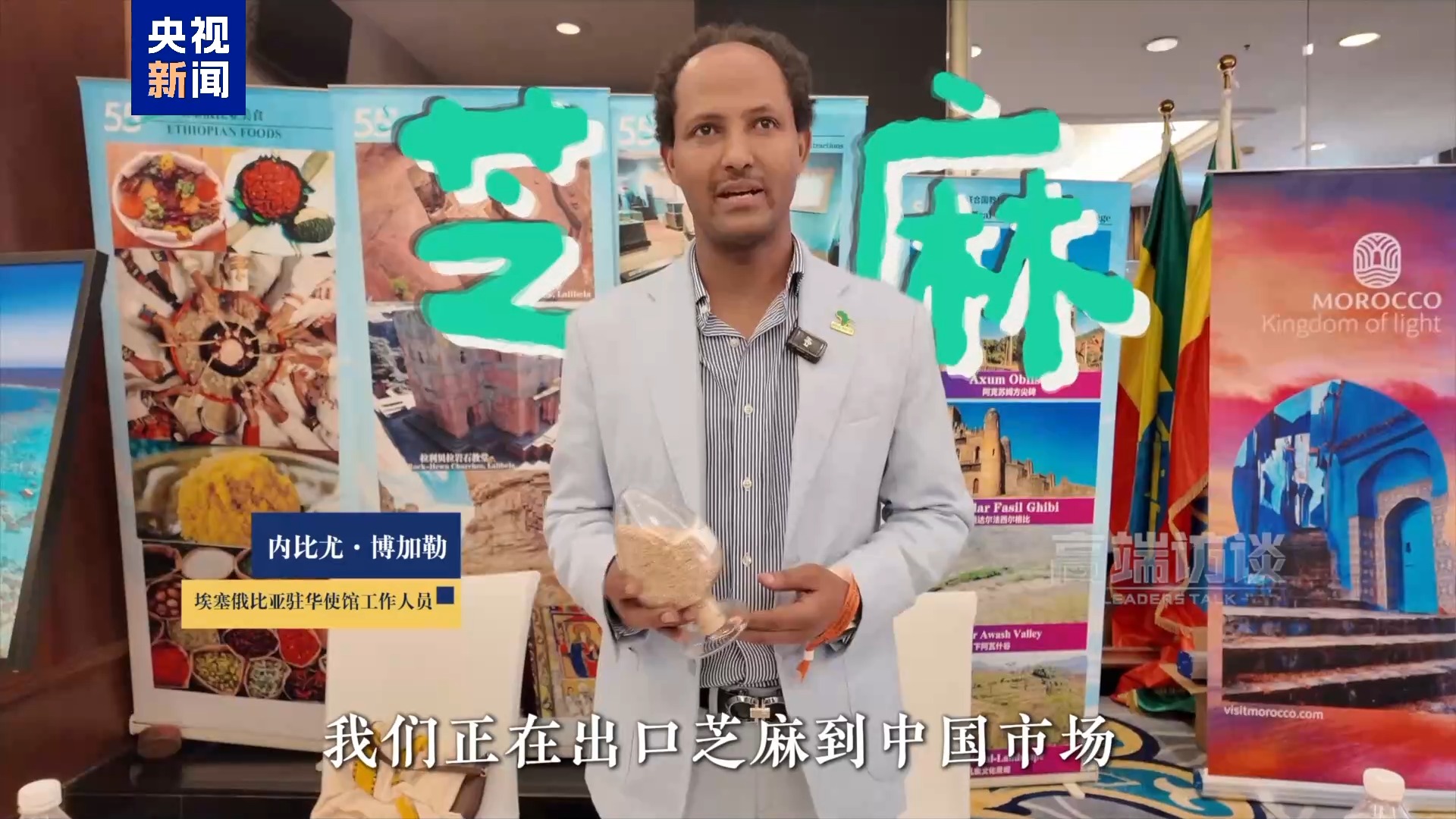 埃塞俄比亞駐華使館工作人員 內(nèi)比尤·博加勒:這是芝麻,我們正在出口芝麻到中國市場。這是埃塞俄比亞的優(yōu)質(zhì)芝麻產(chǎn)品,它們以自然有機(jī)聞名。我們受惠于中國的貿(mào)易政策,借助中非合作的平臺將這些芝麻出口到中國市場。