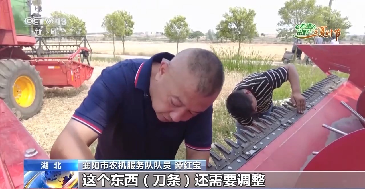 農(nóng)機(jī)維修也是夏收中非常重要的一個(gè)環(huán)節(jié)。在湖北省襄陽(yáng)市襄州區(qū)黃龍鎮(zhèn)潘明村的1000畝大田里,6臺(tái)收割機(jī)正趕在雨前搶收。突然,一臺(tái)收割機(jī)出現(xiàn)故障止步不前,機(jī)手撥打維修電話20分鐘后,農(nóng)機(jī)服務(wù)車趕到了麥田旁。經(jīng)過(guò)檢修發(fā)現(xiàn),這臺(tái)收割機(jī)刀條發(fā)生了斷裂。