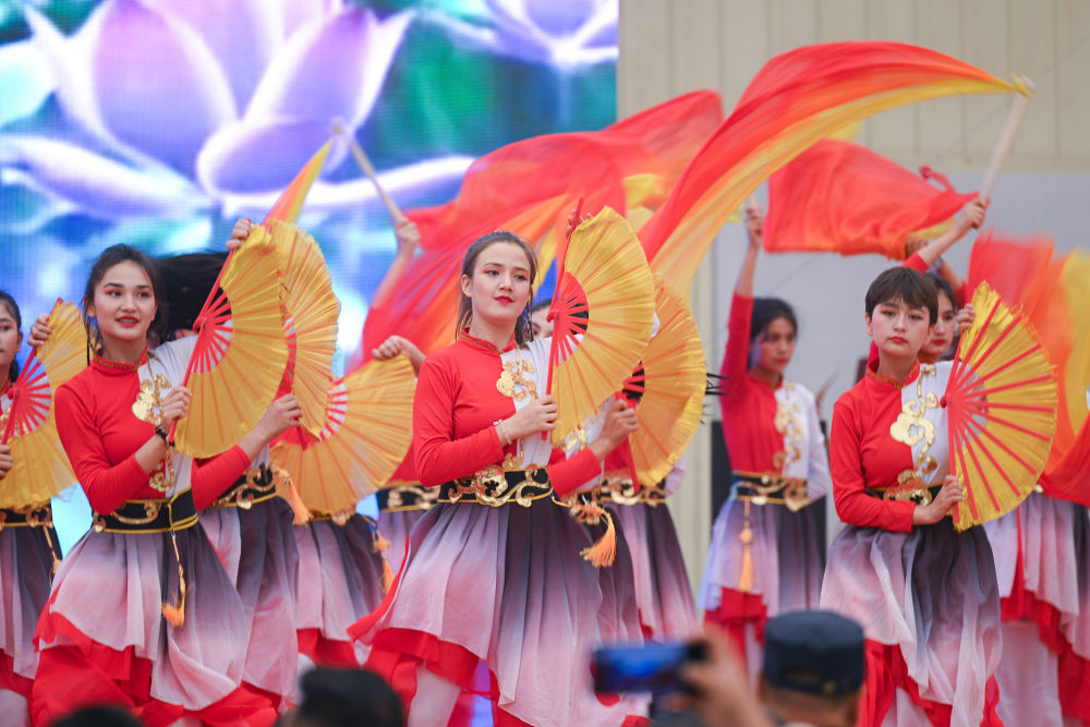 2025年5月28日,演員在2025中國環(huán)塔國際拉力賽新疆喀什地區(qū)葉城縣賽段迎賓晚會(huì)上表演。新華社記者 辛悅衛(wèi) 攝