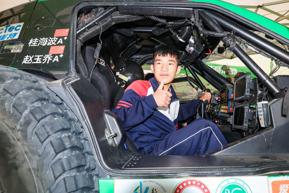 2025年5月31日,新疆喀什地區(qū)麥蓋提縣的中學(xué)生在環(huán)塔營地參觀時(shí)與賽車合影。新華社發(fā)(環(huán)塔組委會(huì)供圖)