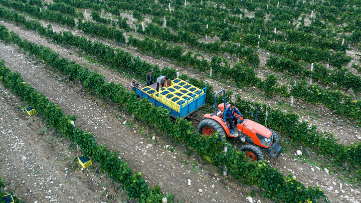 工人在寧夏沃爾豐釀酒葡萄種植基地轉(zhuǎn)運(yùn)采摘下的釀酒葡萄(2024年9月19日攝,無人機(jī)照片)。