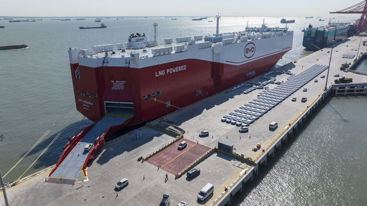 2025年4月26日,出口汽車在蘇州港太倉(cāng)港區(qū)碼頭集中裝載上“深圳號(hào)”汽車運(yùn)輸船(無(wú)人機(jī)照片)。新華社發(fā)(王須中 攝)