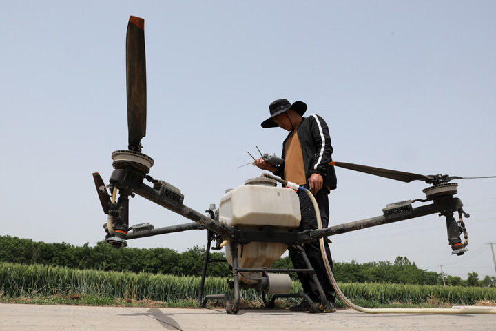2025年5月7日,在河南省焦作市溫縣祥云鎮(zhèn)古賢村,村民為植保無人機(jī)添加藥液開展“一噴三防”。新華社發(fā)(徐宏星攝)
