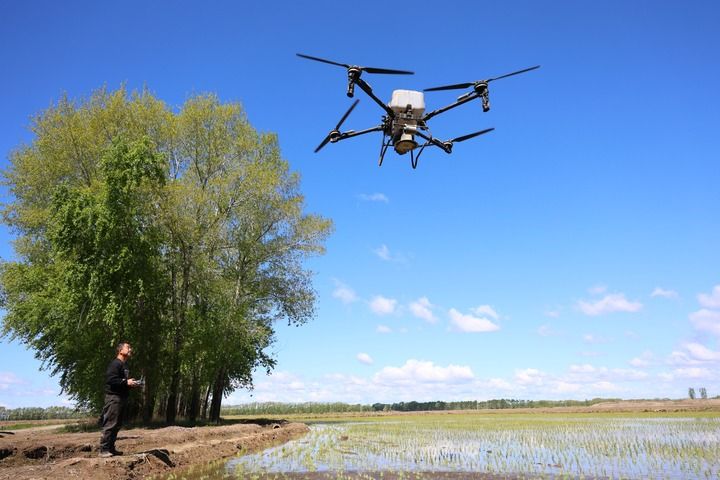 2025年5月21日,在北大荒集團(tuán)黑龍江綏濱農(nóng)場(chǎng)有限公司東井管理區(qū),操作員操控搭載北斗導(dǎo)航系統(tǒng)的植保無人機(jī),對(duì)即將施返青肥的地塊進(jìn)行打點(diǎn)。新華社發(fā)(李興攝)