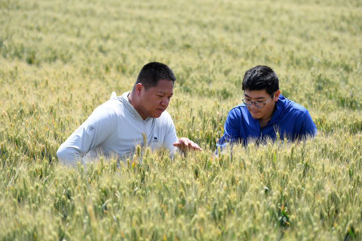 賈俊杰(左)和農(nóng)業(yè)技術(shù)員在山西運(yùn)城永濟(jì)市虞鄉(xiāng)鎮(zhèn)麥田里查看小麥生長(zhǎng)情況(2025年5月21日攝)。新華社發(fā)(薛俊攝)