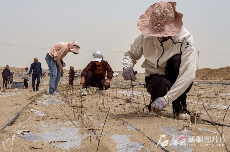6月13日,在唐農萬物(且末)生態(tài)科技有限公司實驗示范基地,工人在補植蛋白桑。