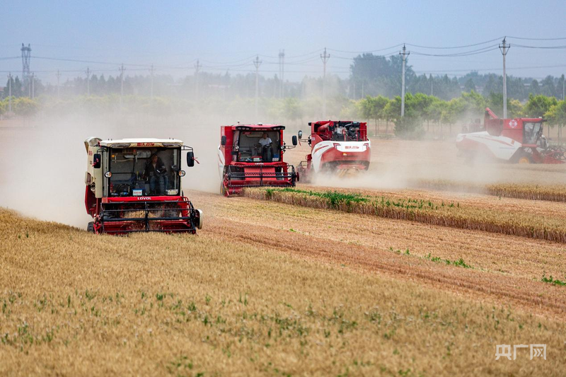 種糧大戶張洪文的4臺聯(lián)合收割機(jī)開足馬力馳騁在麥田里(央廣網(wǎng)發(fā) 王建安 攝)