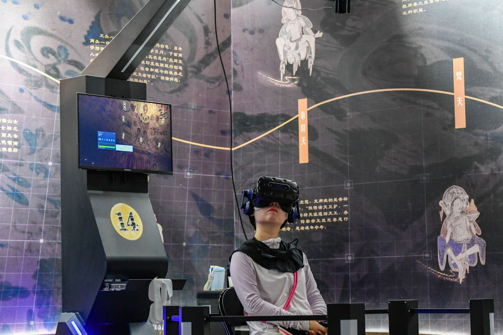 5月17日,游客通過VR設(shè)備游覽太原北齊壁畫博物館。新華社記者 楊晨光 攝