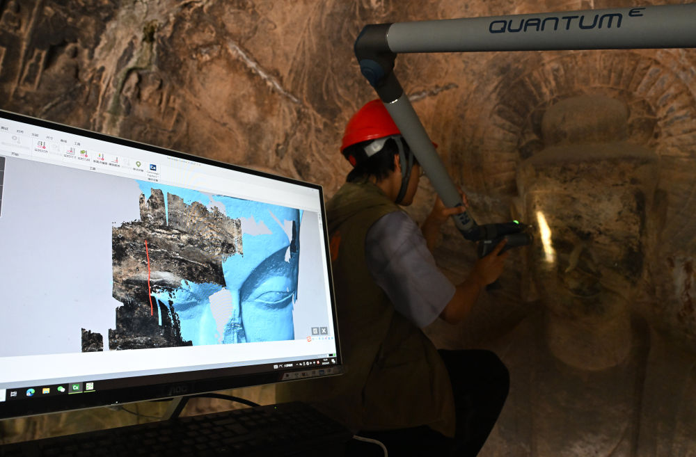 4月9日,武漢大學(xué)文化遺產(chǎn)智能計(jì)算實(shí)驗(yàn)室團(tuán)隊(duì)成員在龍門石窟魏字洞使用關(guān)節(jié)臂掃描儀對佛像進(jìn)行數(shù)字化掃描。新華社記者 李嘉南 攝
