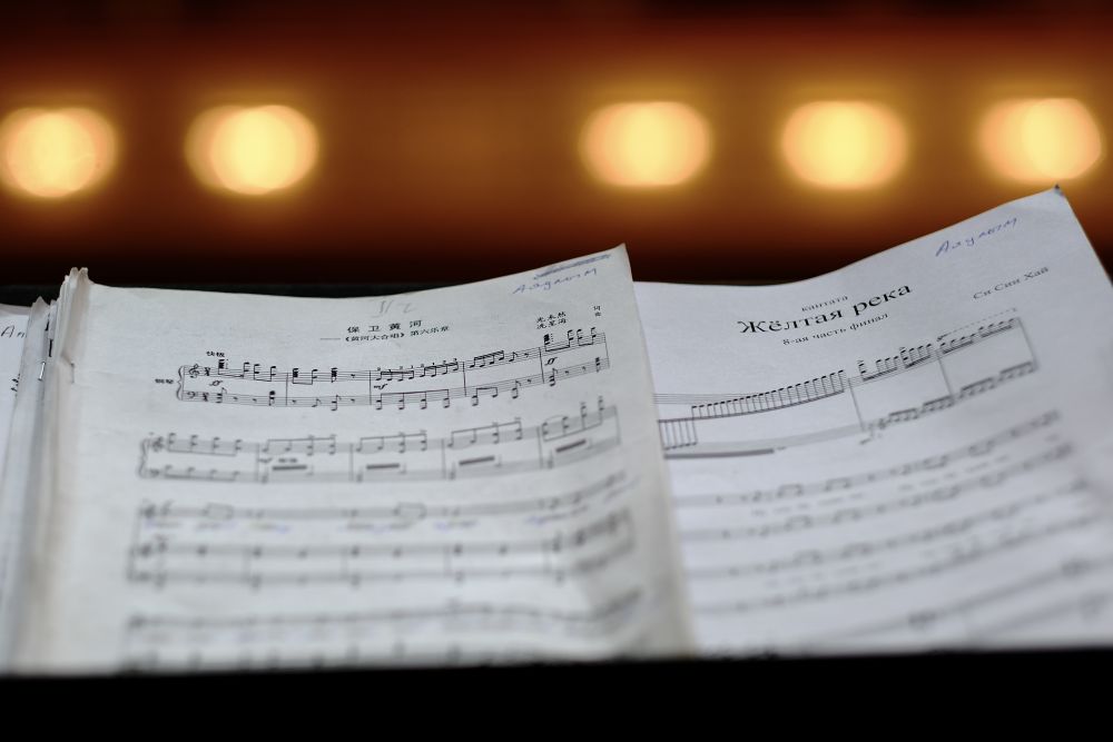 6月12日,在哈薩克斯坦阿拉木圖江布爾國(guó)家音樂廳拍攝的《黃河大合唱》中、俄文曲譜。新華社記者 鄭開君 攝